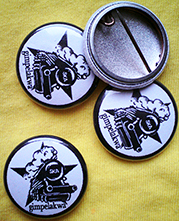2 Aufkleber 1,- | 1 Button 1,- | - 1 Plakat 2,- |